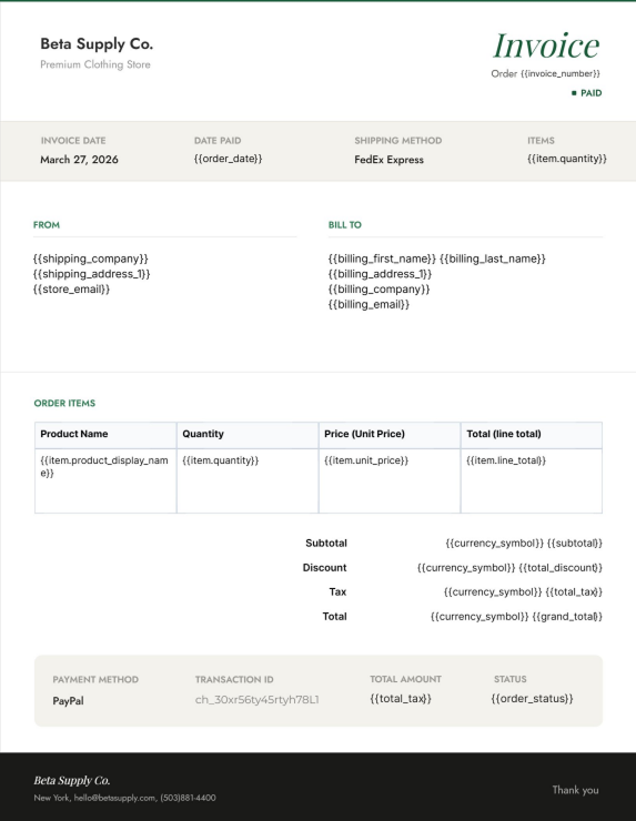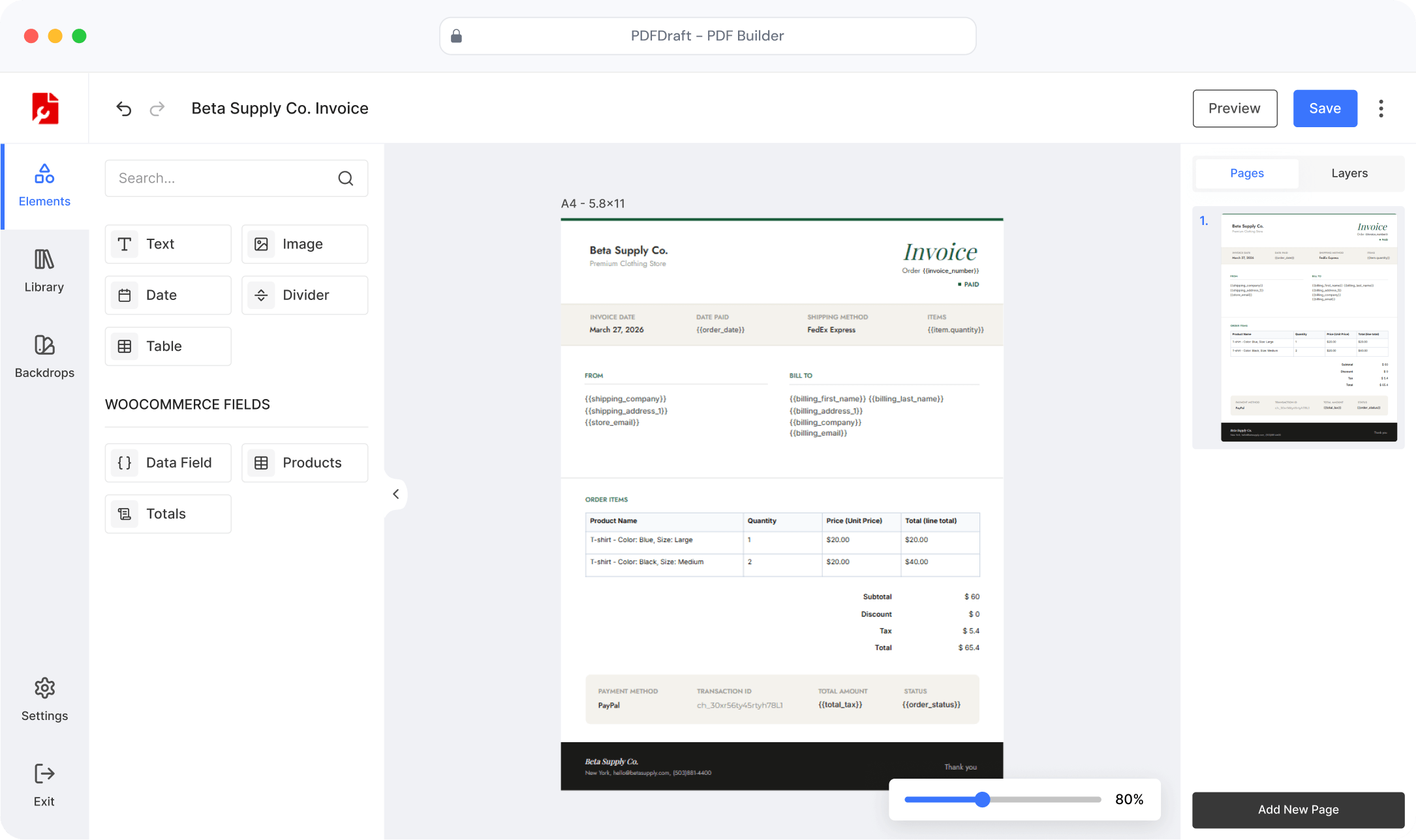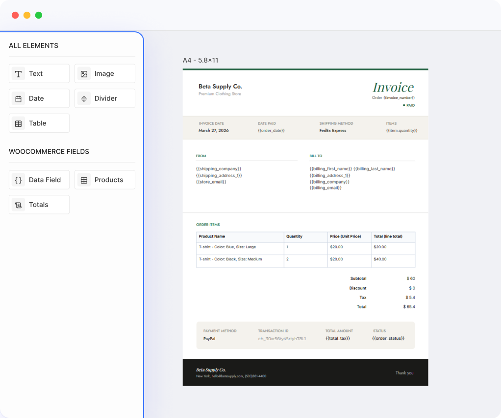 Add text, images, tables, and WooCommerce data anywhere on your invoice.